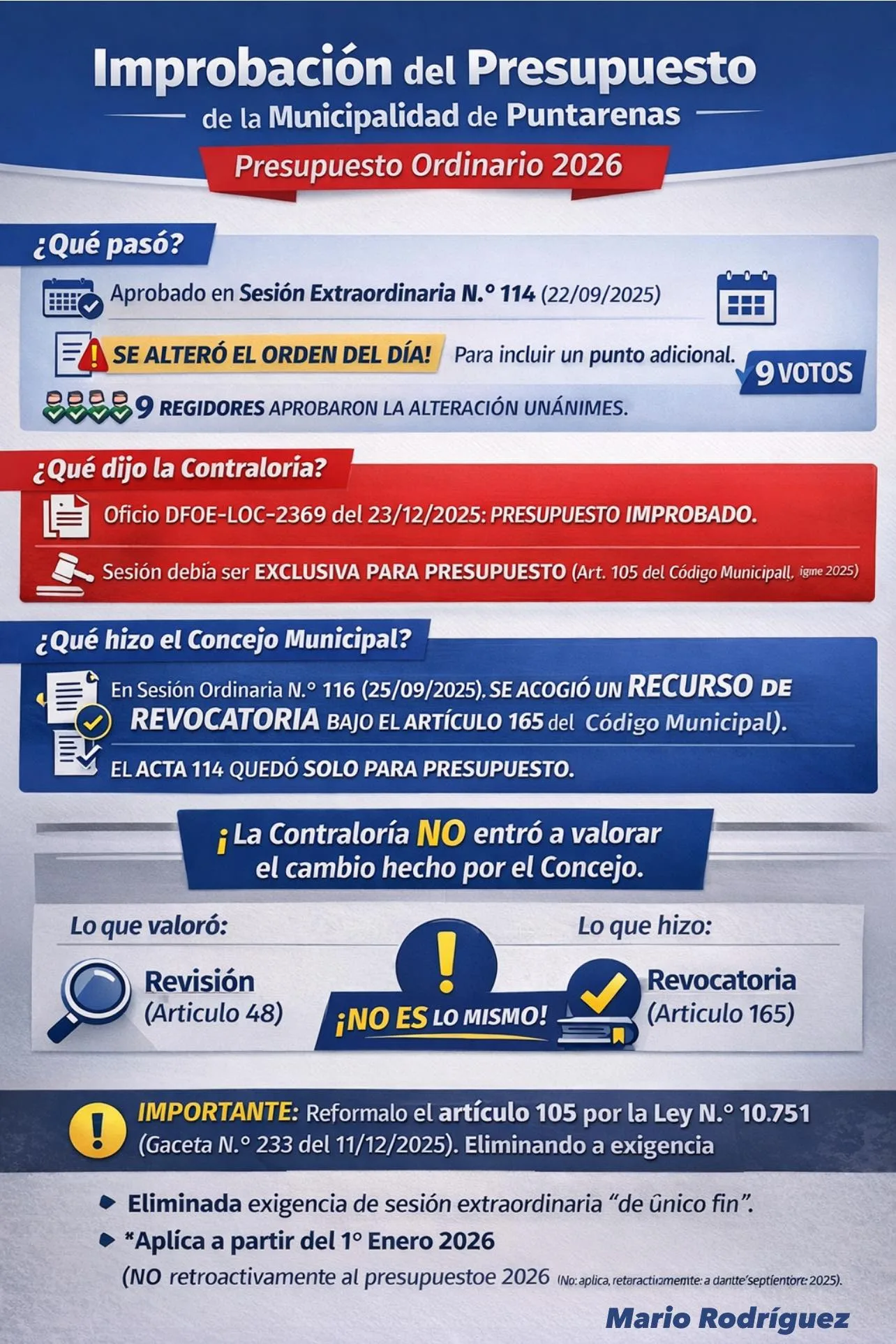 Rodríguez sostuvo que la improbación responde a un error de procedimiento y no a observaciones sobre el fondo técnico del presupuesto. Señaló que la sesión extraordinaria número 114, celebrada el 22 de setiembre de 2025, fue convocada para aprobar el presupuesto, pero que se aprobó una alteración del orden del día —de forma unánime— para incluir un punto adicional relativo a una puesta en comisión.