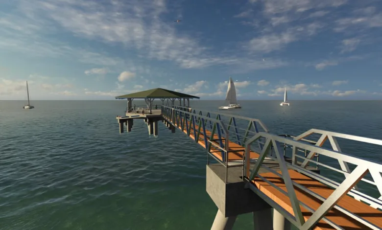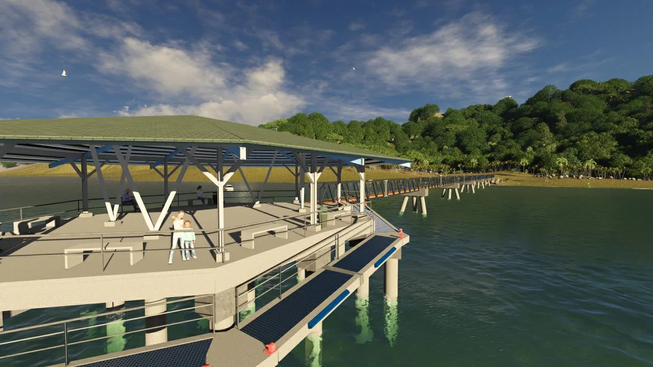 La infraestructura final contempla un espigón de aproximación, una pasarela de acceso, un muelle fijo con rampa perimetral y una estructura tipo marquesina.