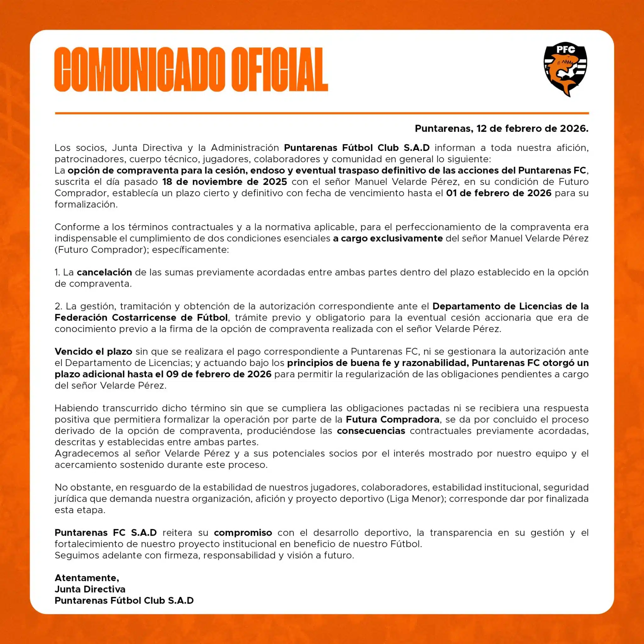 Puntarenas, 12 de febrero de 2026. El Puntarenas Fútbol Club S.A.D. informó este jueves que dio por concluido el proceso relacionado con la opción de compraventa para la cesión, endoso y eventual traspaso definitivo de sus acciones.
